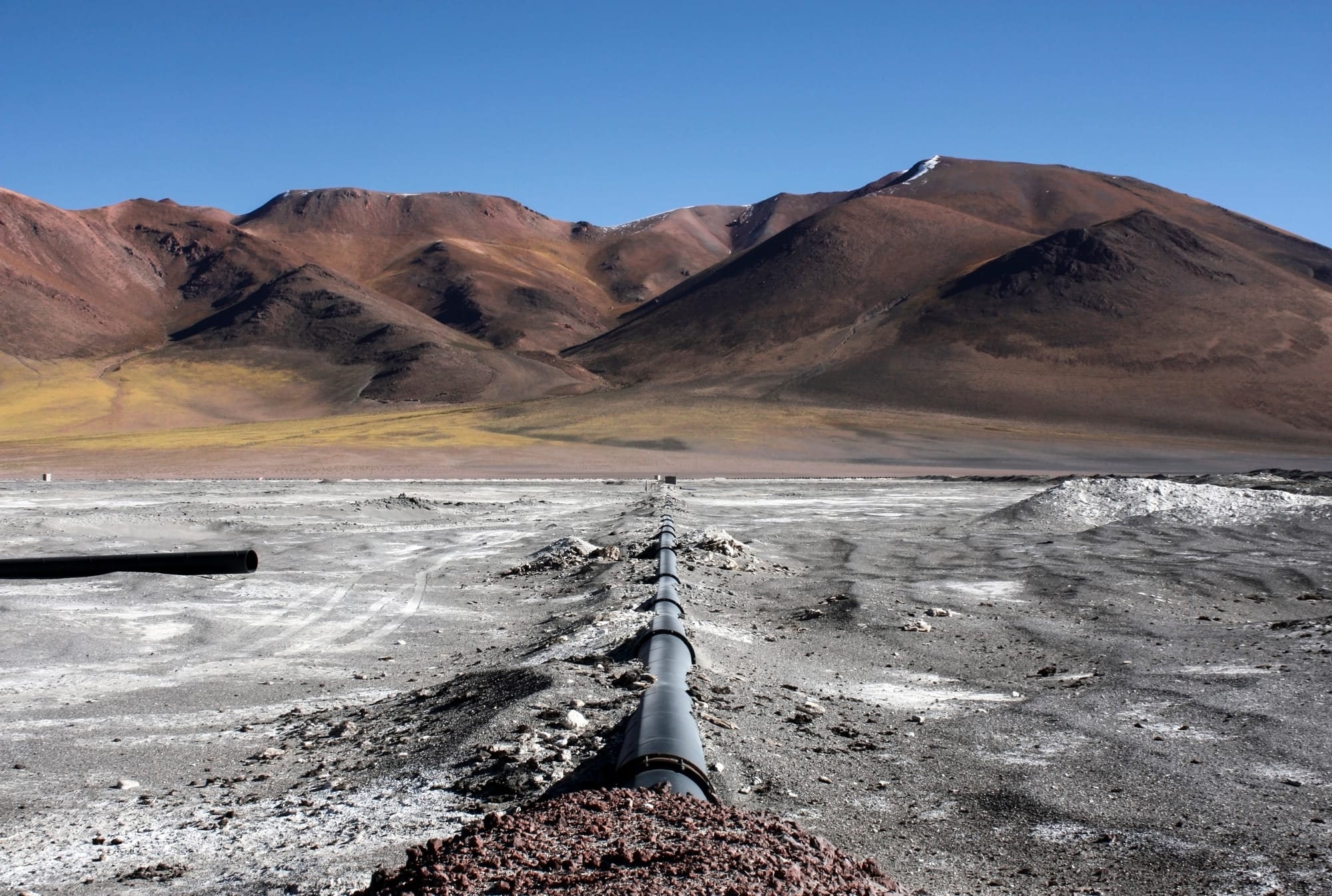 Tubería de extracción de agua en el salar Ojos de San Pedro, Región de Antofagasta, Chile. Este Salar era una antigua laguna que fue desecada a finales de la década de 1960 por las faenas de las mineras Radomiro Tomic y Chuquicamata, ambas de la empresa Codelco. Esta tubería extrae agua del río San Pedro de Inacaliri y forma parte de la red de más de 350 kilómetros de cañerías hídricas distribuidas en la cuenca del río Loa y destinadas en un gran porcentaje a la minería. | Gaspar Abrilot