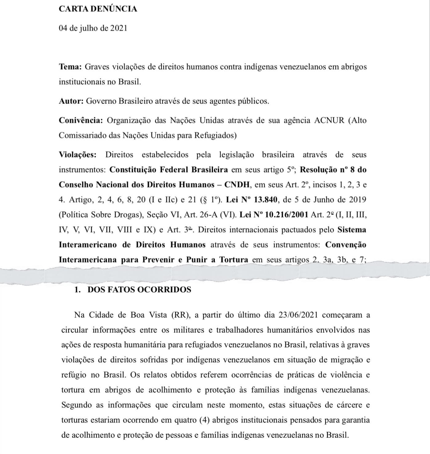 Los funcionarios piden en el documento una “urgente intervención del Ministerio de la Mujer, la Familia y los Derechos Humanos” de Brasil, así como actuación por parte del ACNUR (Alto Comisariado de las Naciones Unidas para los Refugiados), agencia de la ONU que da apoyo al Ejército brasileño en los 14 abrigos del estado de Roraima.