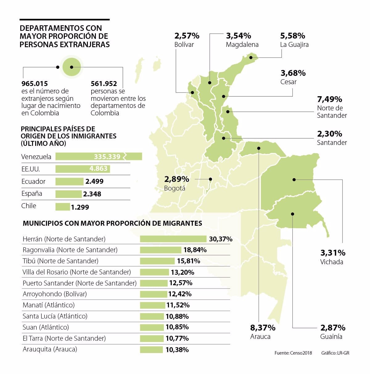 Mientras el Norte de Santander es el segundo departamento con más población migrante, con el 7,5%, César está en cuarto lugar con el 3,7%, y Santander está en décimo lugar con una población migrante del 2,3%.