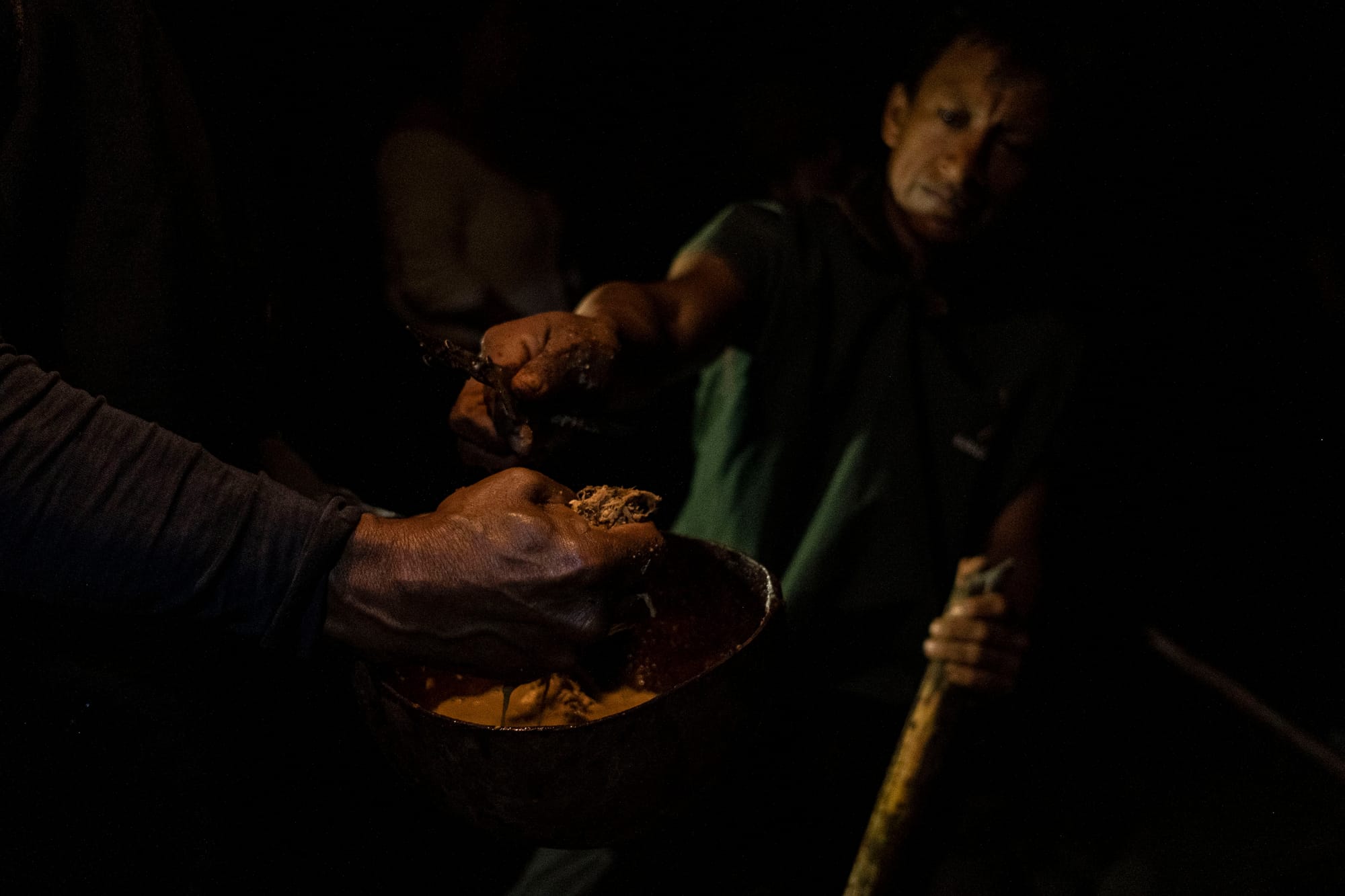 Todos los convocados a Sinangoe debemos entrar al mismo sueño. A las 4h00 de la madrugada, junto al río Aguarico, los taitas Luciano Lucitante, Ángel Quenamá, Patricio Criollo y Edison Lucitante, presiden la ceremonia de yoko, una liana de espíritu femenino que ayuda a preparar el camino para el yagé. Se raspa la corteza en un cuenco, se mezcla con agua, se torna marrón y rojiza, espumosa y luego espesa. La bebida se pasa de mano de un hombre a otro hombre, y de una mujer a otra mujer. No se debe romper la línea de energía.