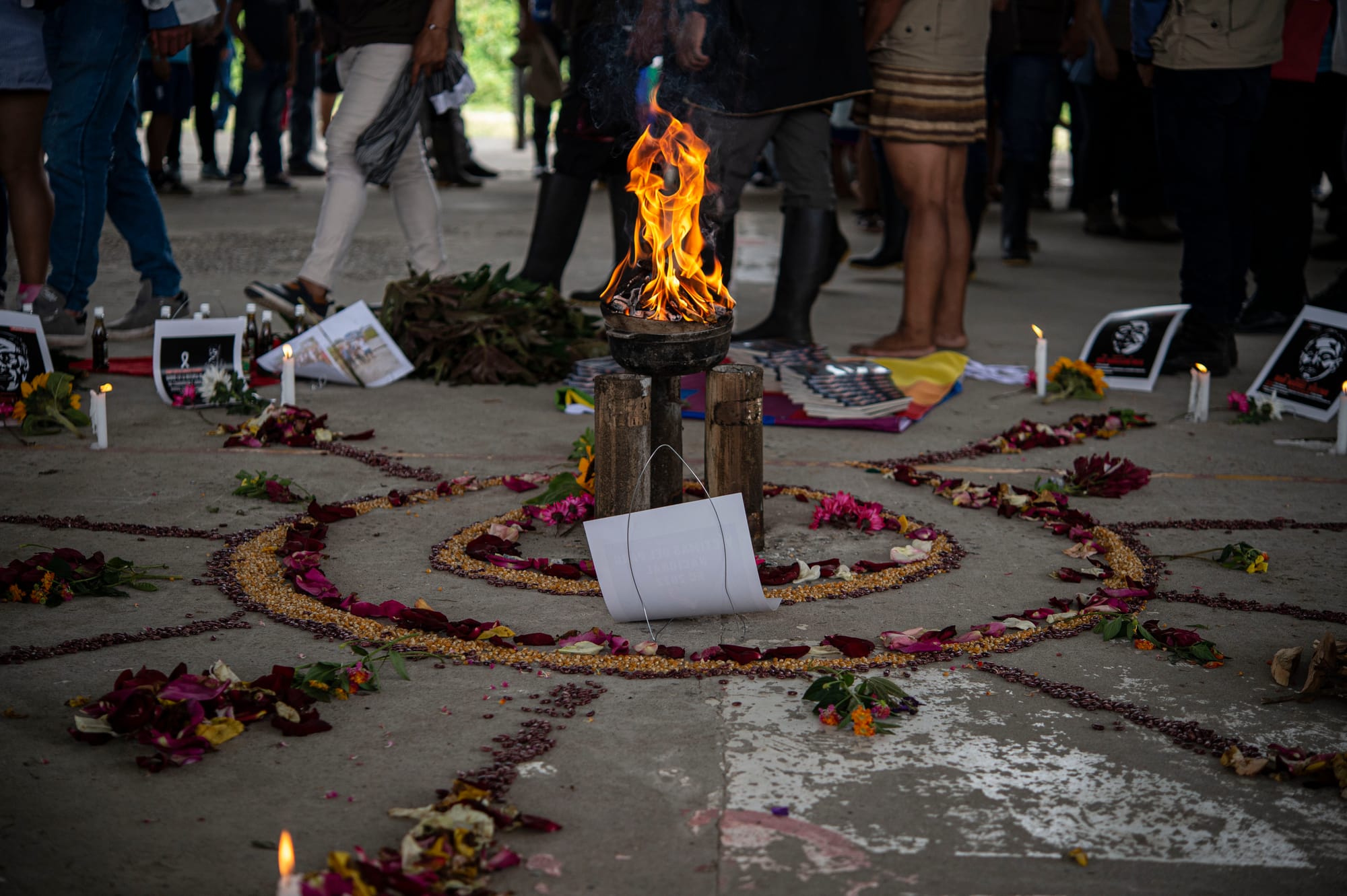 Cuando amanece, las Guardianas del Fuego instalan el altar dibujando la espiral del tiempo con flores y semillas dentro de la chakana, símbolo de la cosmovisión andina. Se instalan veladoras al pie de ocho retratos de los caídos en el Paro Nacional de 2022, elaborados por Zinecdoc. Se enciende el fuego junto a la lanza de Juan Carlos Vargas Chango de 33 años, uno de los fallecidos.