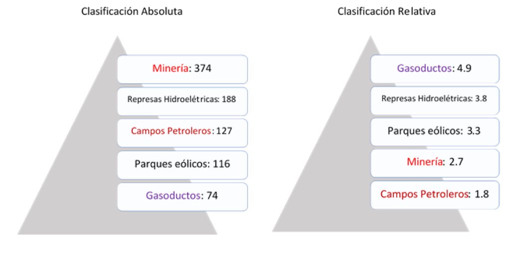 Esta examinación periodística comprende 964 artículos y menciona 304 proyectos extractivos con 879 asuntos conflictivos reportados entre enero de 2006 y enero de 2019. Los resultados (Figura 1) muestran que en términos absolutos, el sector minero tiene el mayor número de asuntos conflictivos, seguidos de las represas hidroeléctricas y los campos petroleros. En términos relativos, los gasoductos (con evaluaciones de impacto medioambiental) son el subsector con el mayor número de asuntos conflictivos reportados, luego de los proyectos de represas hidroeléctricas.