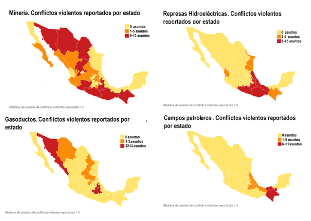Los asuntos conflictivos reportados en la minería, hidrocarbonos y represas hidroeléctricas generalmente están asociados a daños medioambientales, mientras que en los parques eólicos están relacionados a prácticas de mala planificación territorial y en la minería se reportan muchas violaciones de las normas laborales. La figura 2 muestra los estados con el mayor número de asuntos conflictivos violentes. Los estados con conflictos violentos en dos o más sectores son: Chiapas (hidroeléctrica y campos petroleros), Oaxaca (minería e hidroeléctrica), Puebla (minería, hidroeléctrica y campos petroleros), Sonora (minería y gasoductos) y Veracruz (hidroeléctrica y campos petroleros).