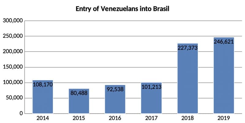 En lo que respecta a la situación migratoria, desde 2017 el Brasil ha adoptado diferentes medidas para la población venezolana. Por un lado, permitió a los venezolanos disfrutar de permisos de residencia, lo que benefició a unas 125 mil personas, con datos de noviembre de 2019. Por otra parte, la solicitud de la condición de refugiado en Brasil también es una posibilidad que se ha fortalecido desde junio de 2019, cuando el Brasil reconoció la existencia de violaciones graves y generalizadas de los derechos humanos en Venezuela, permitiendo así la aplicación de la definición regional de refugiado de la Declaración de Cartagena de 1984.