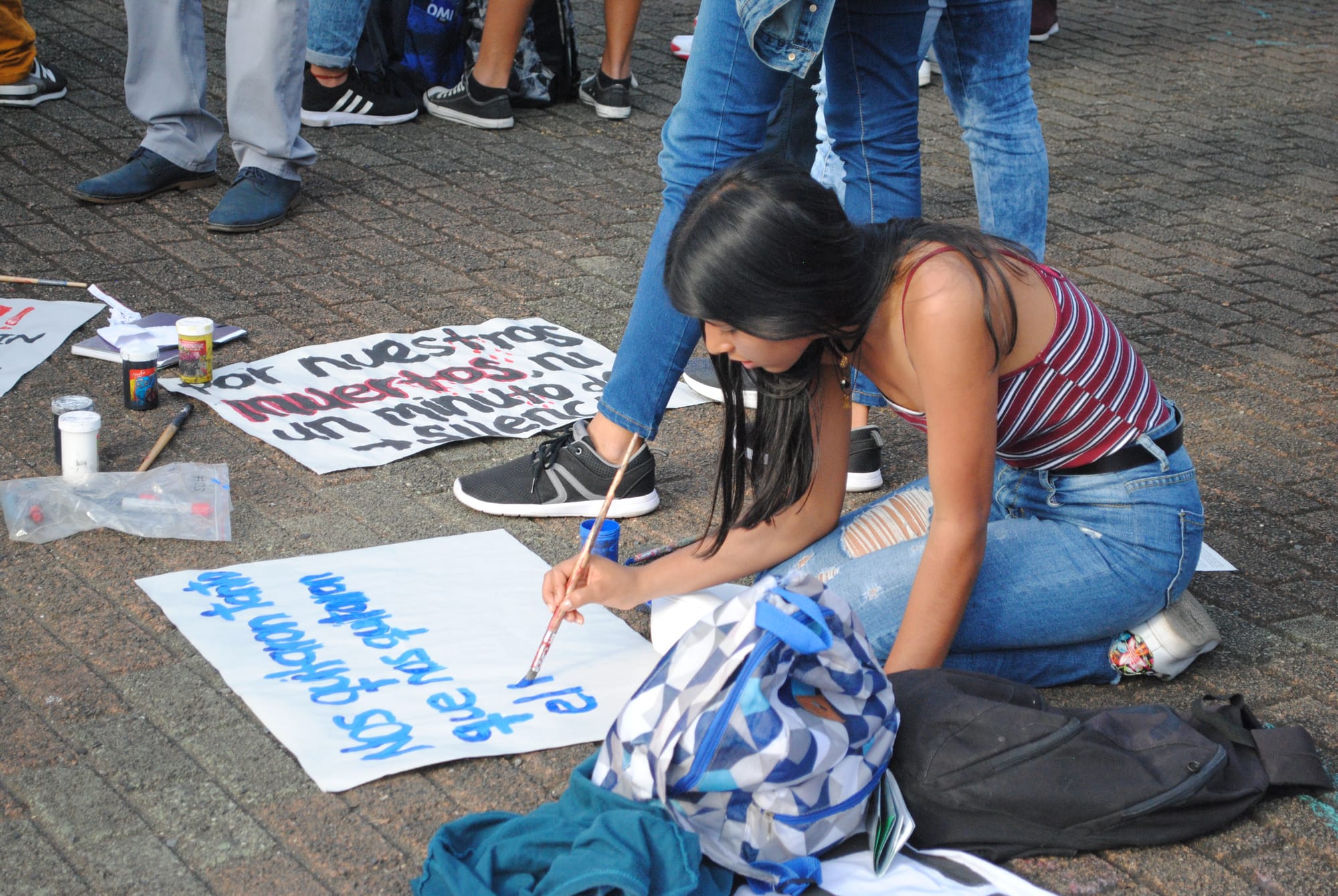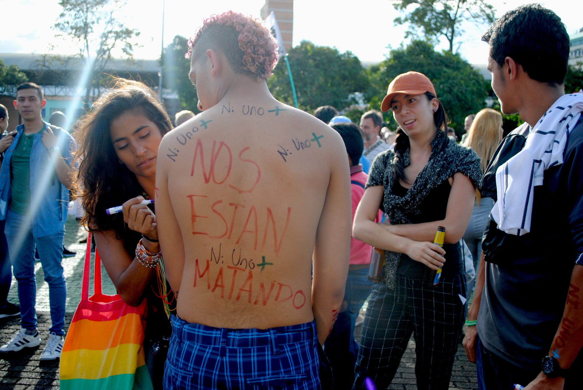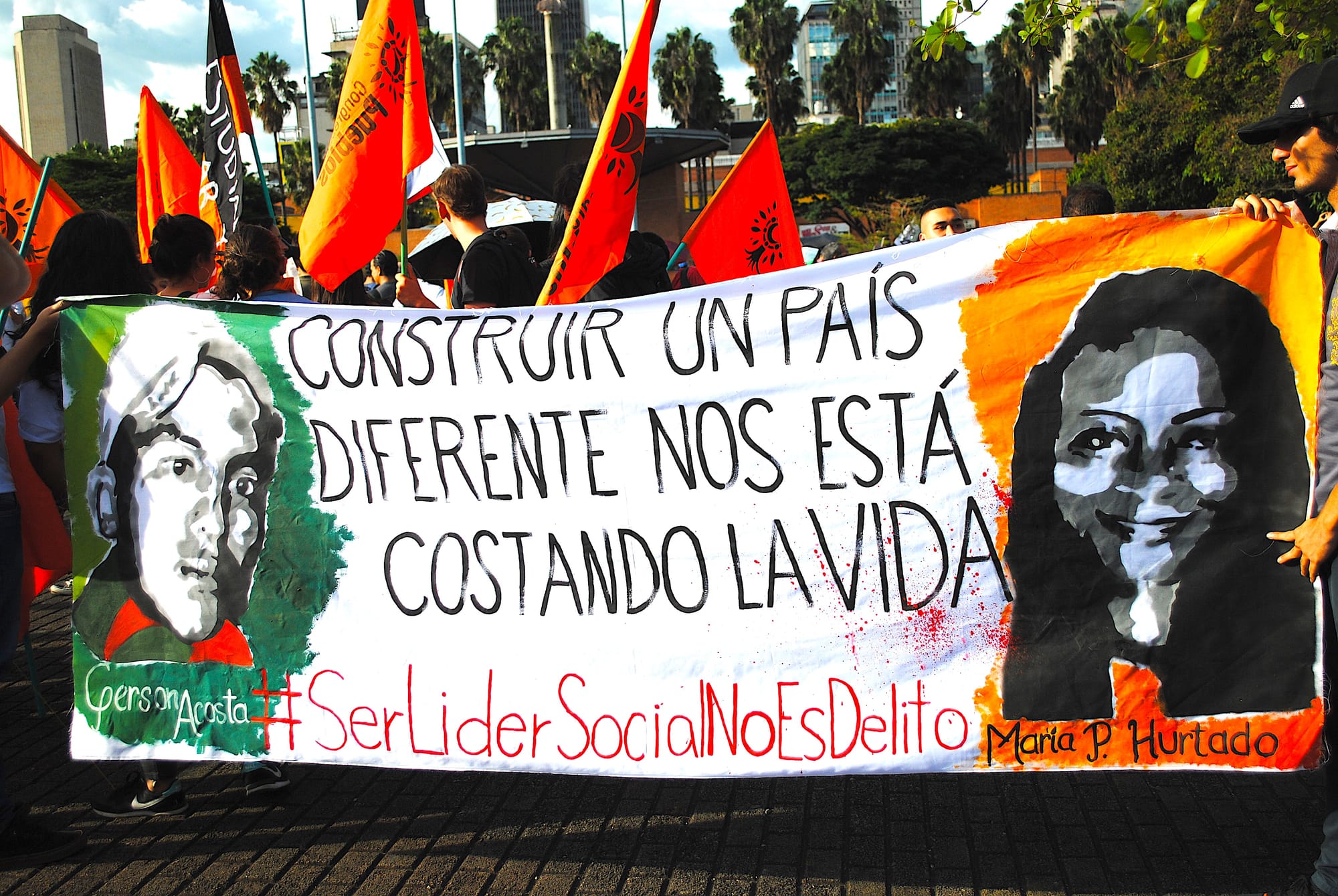 “Los líderes y las lideresas sociales arriesgan sus vidas para luchar por nuestros derechos. Entonces, ya era hora de que saliéramos a defender los suyos”. Un grupo de jóvenes pintan una franja larga de material negro con todos los nombres de los líderes sociales que han sido asesinados desde que se firmó el acuerdo de paz. “Son 210 líderes asesinados desde la firma, 210 defensores de sus comunidades y de los derechos humanos en sólo dos años y siete meses. Tenemos que entender que no hay paz si se siguen ejecutando a nuestros líderes y lideresas” nos explica una de las activistas del grupo. Desde nuestra conversación tuvo lugar, ya han asesinado a dos líderes más: Yissela Trujillo, una activista ambiental de Caquetá, y Emilio Vitucay, un líder indígena de Chocó.