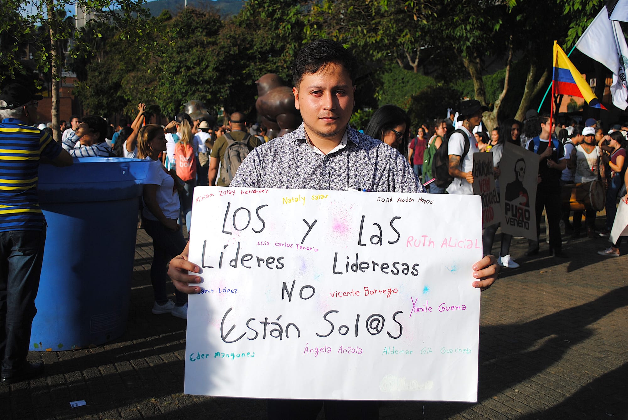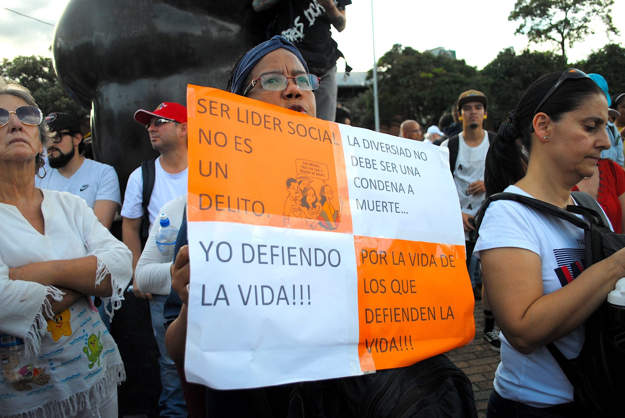 “Estos líderes son líderes de la paz, y por eso tenemos la obligación de salir a las calles y demostrar que no están solos” dice una manifestante en el Parque de San Antonio en Medellín. Los y las manifestantes se unen en este lugar altamente simbólico donde tuvo lugar, en 1995, un atentado contra civiles durante un festival de música, matando a 29 personas e hiriendo a más de 200.