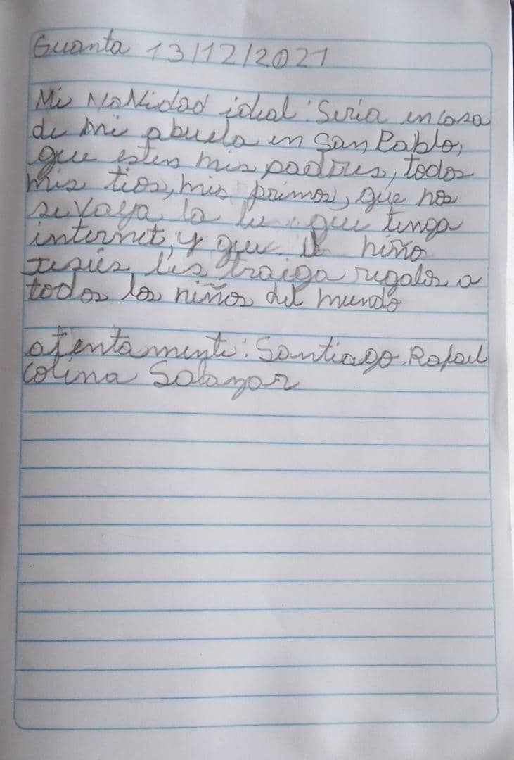 “Nuestra tradición es pasar estas fechas en casa de mi mamá, en San Pablo. Por eso, antes de salir hacia allá el 24 de diciembre él le deja sus felicitaciones. Luego, cuando regresamos le cuenta todo lo que hizo y lo que le trajo el Niño Jesús”, cuenta Arabella, su madre.