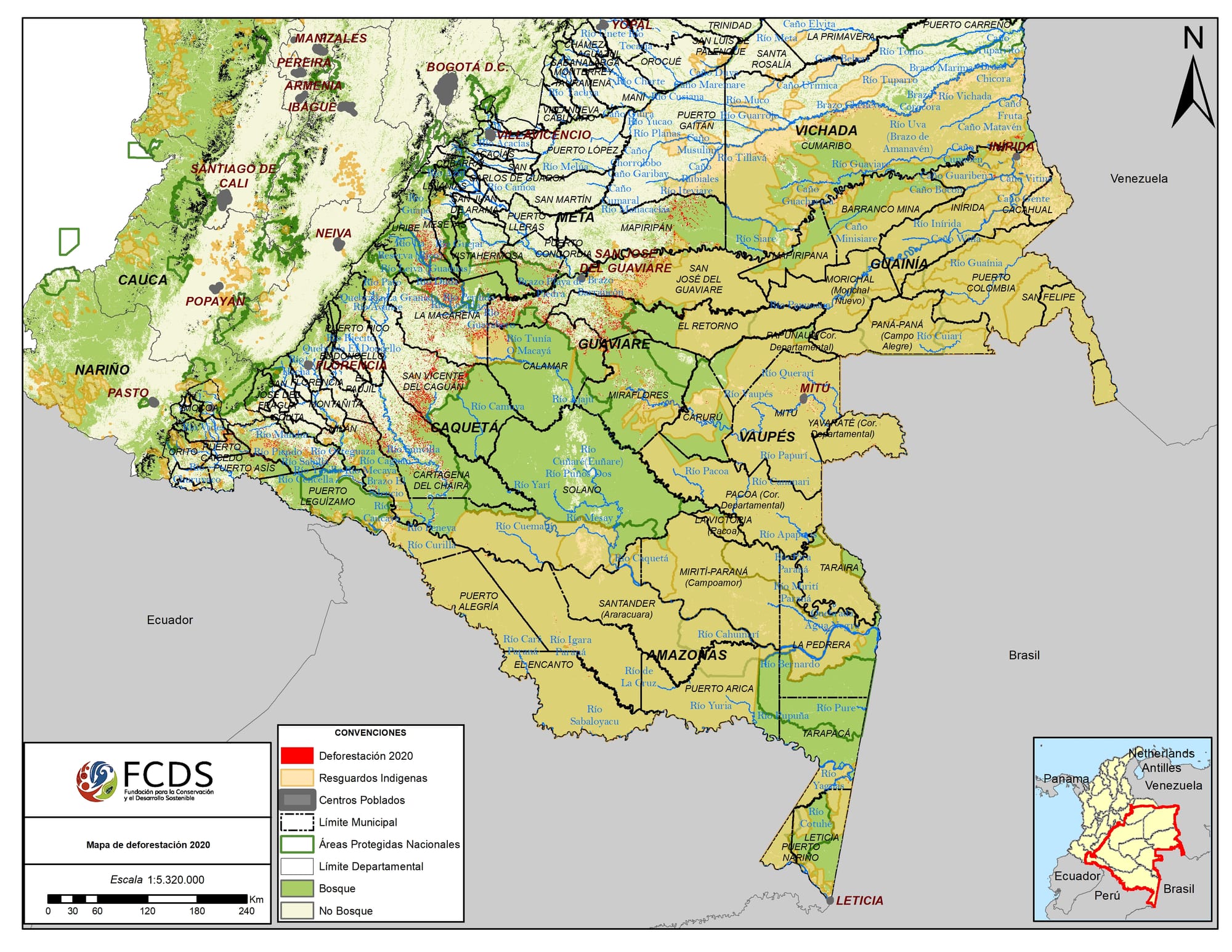 Algo similar sucede en Colombia. Aunque el jueves 9 de julio el Instituto de Hidrología, Meteorología y Estudios Ambientales (Ideam) presentó su nuevo reporte sobre deforestación durante 2019 , que muestra una reducción total de un 19,2%, entre enero y abril de 2020 la deforestación en la Amazonía Colombiana no es esperanzadora. En 2019 se deforestaron un total de 158.894 hectáreas. Según un reporte de la Fundación para la Conservación y el Desarrollo Sostenible (FCDS) con datos obtenidos con el apoyo de la Rainforest Foundation, USAID, el Andes Amazonian Fund y la Fundación Gordon y Betty Moore, durante los primeros tres meses de 2020 se reportaron más de 58.000 eventos de foco de calor y se arrasaron más de 75.000 hectáreas en la Amazonía colombiana. Esto significa que, en los primeros meses del año se deforestó un 47,4% del total deforestado en 2019.