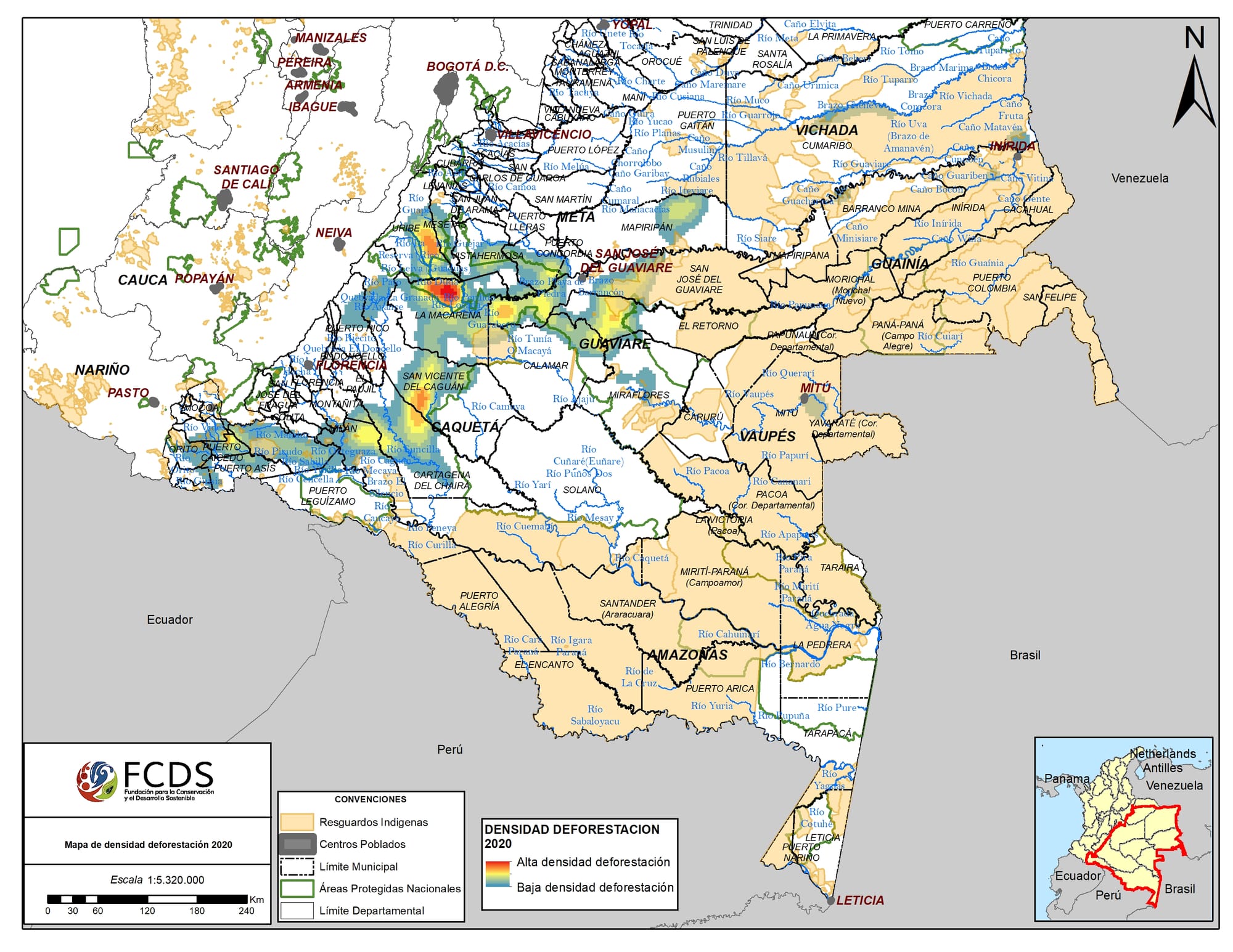 El primer mapa muestra la deforestación en la Amazonía colombiana y cómo se traslapa con los resguardos indígenas, las zonas pobladas, las zonas de bosque, las zonas naturales protegidas y los límites departamentales; el segundo, muestra la densidad por zonas de calor durante 2020. Las zonas con colores amarillo, naranja y rojo son altas en su densidad de deforestación y las azules y verdes son más bajas.