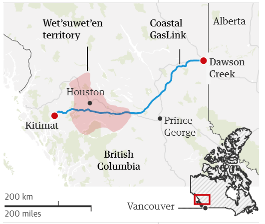 - Todo empieza por el proyecto de la multinacional Coastal GasLink de construir un gasoducto que atraviesa territorios indígenas, tanto en Canadá como en Estados Unidos.