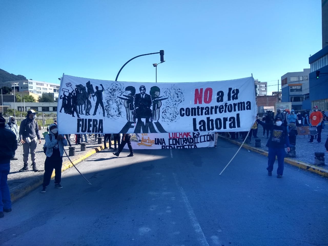 Desde el 1 de mayo, Día del trabajo, los plantones se vienen dando con pancartas y consignas. La pandemia ha ido desfavoreciendo la garantía de los derechos laborales y continúa: el Ministerio de Trabajo estableció cuatro modalidades emergentes de trabajo con base en el Acuerdo 76 para teletrabajo (372 503 teletrabajadores), el Acuerdo 77 que permite la reducción, modificación o suspensión emergente de la jornada laboral, y el Acuerdo 80 para el pago prorrogado de remuneración. A ello se suma el decreto presidencial 1053 de jornadas especiales en el sector público, que dieron paso a más despidos hasta el 22 de mayo. Ciento cincuenta mil empleos se perdieron en tres meses y el Estado dejó de recibir 12 mil millones de dólares.