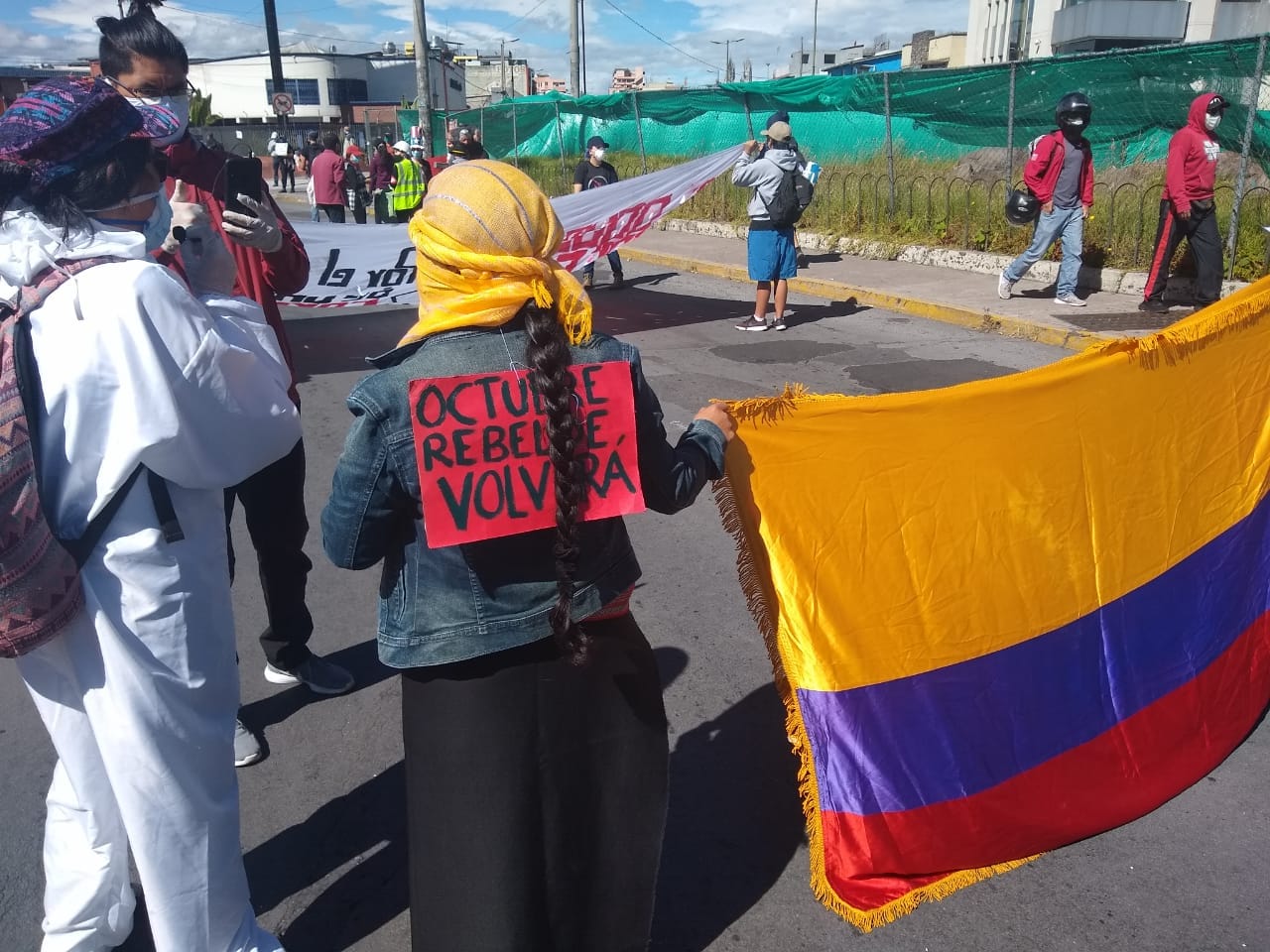 Mascarillas, trajes de bioseguridad, guantes negros, azules, blancos son parte del nuevo protocolo de la pandemia y lo que se pueda cumplir del distanciamiento social en medio de una protesta. Los quiteños salieron a las puertas de sus casas y se asomaron a los balcones para aplaudir a la marcha que pasaba.