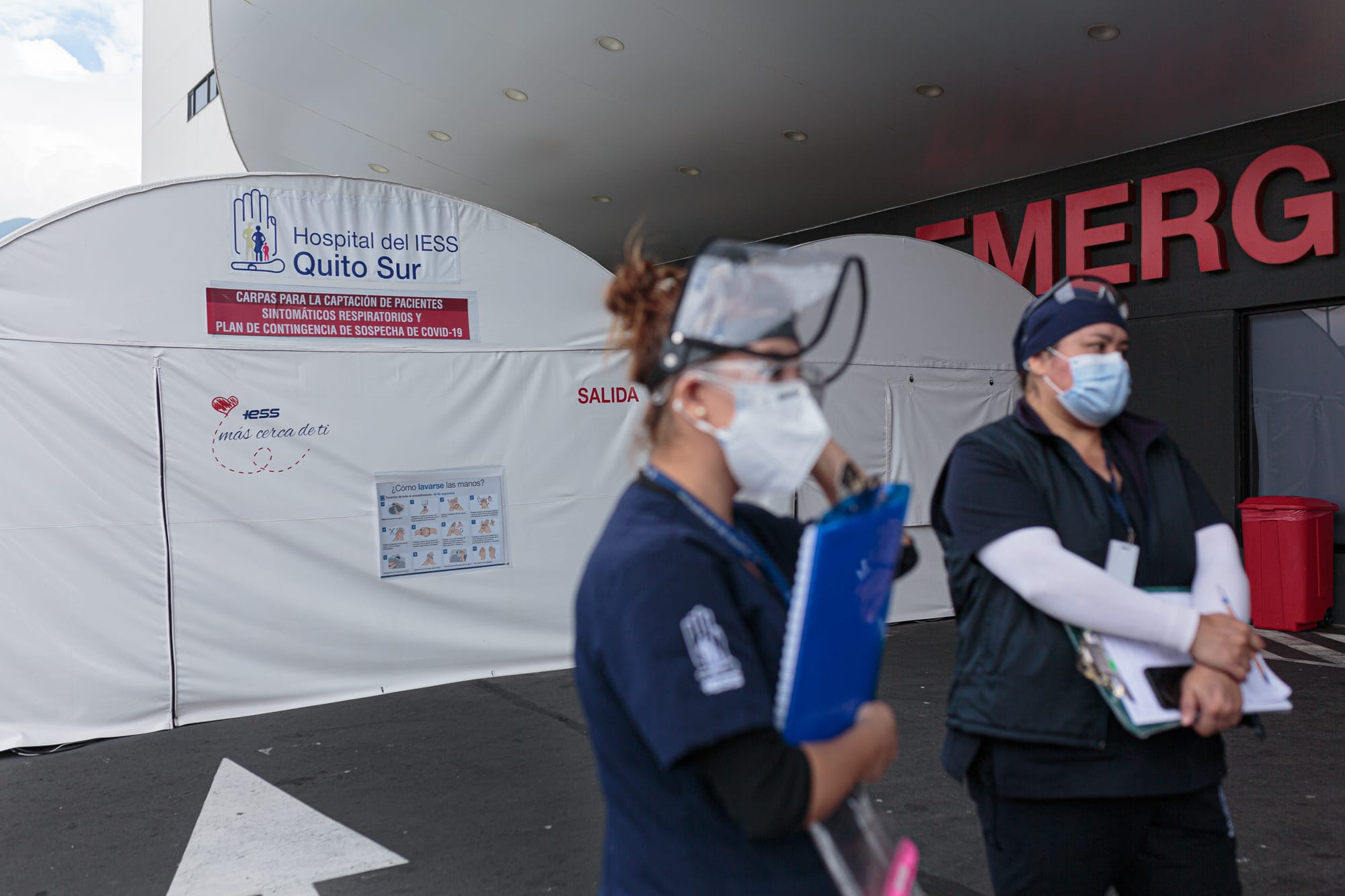 El primer rostro que ve un paciente que llega a urgencias, es el de María Fernanda Villafuerte (36 años) o el de Vilma Ruiz (47 años), personal que se encarga de atención al usuario. Llevan puestas cubrebocas, recogido el cabello, una gorra de tela que lo cubre, y un visor que protege sus ojos. Los doctores salen a dar los informes del estado de los pacientes entre las 12h00 y 14h30.