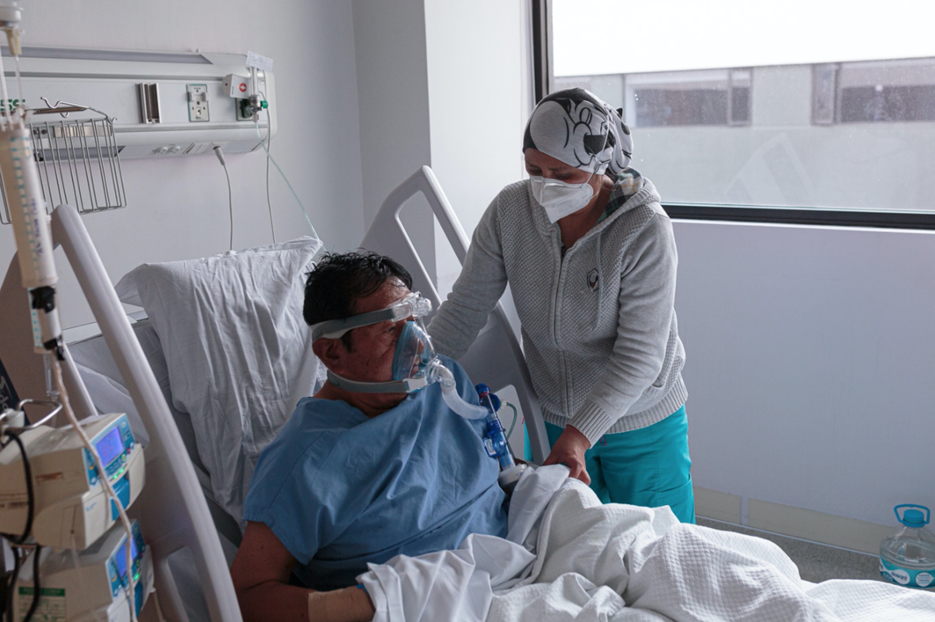 Otro de los pacientes que el doctor Ojeda vigila es Carlos de 65 años. ¿Cómo vamos?, pregunta, ¿Cómo sigue?, ¿Se siente mejor? ¿Ya no tiene esa falta de oxígeno? Lleva cinco días internado. Cuenta que sintió dolor de rodillas y un dolor “seco” en el pecho. No tuvo dolor de cabeza ni tos. No tiene idea dónde se contagió. Carlos no puede respirar y recibe asistencia con diversos aparatos que lo conectan con sondas y mangueras a una mascarilla. El olor de aerosoles combinado con el medicamentos traspasa las mascarillas. Los acompañantes de la habitación son cuidadores, sus propios familiares.