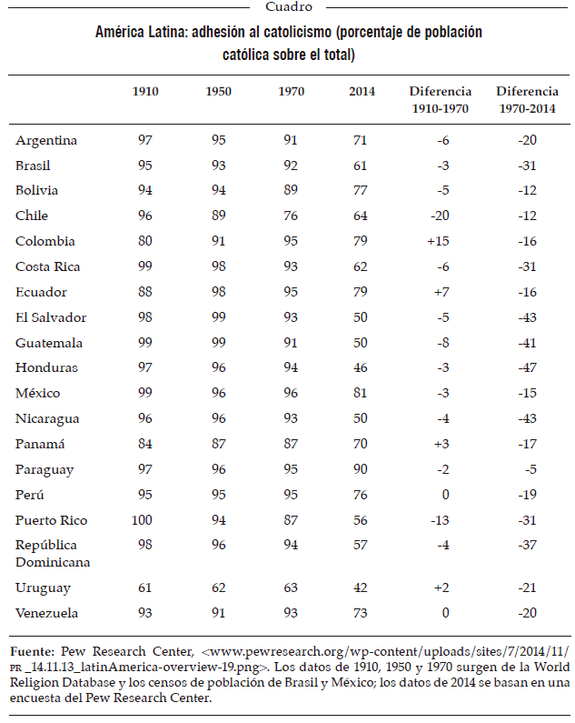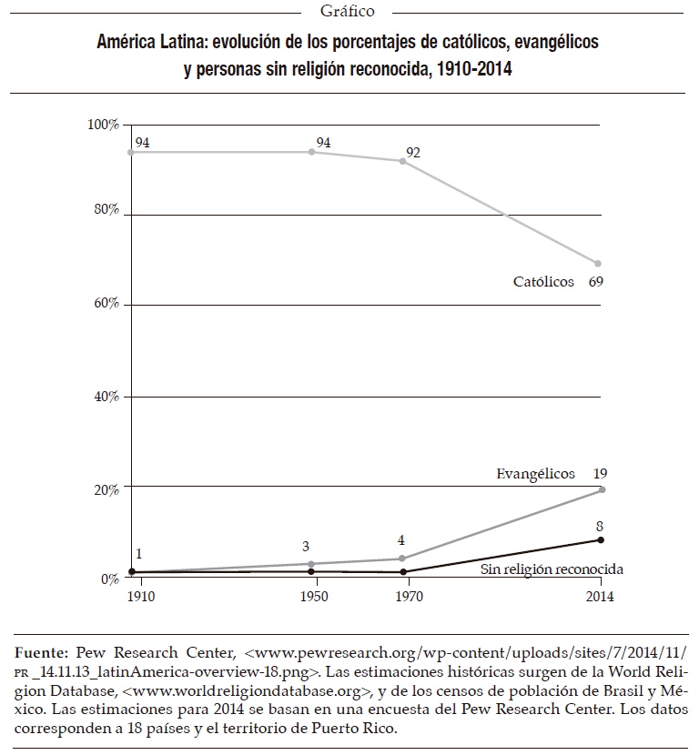 El gráfico y el cuadro de las próximas páginas permiten captar con bastante aproximación la situación cuantitativa de los evangélicos en América Latina como región en su conjunto y en los distintos países. En el gráfico, puede observarse la magnitud del cambio global en la región: entre 1910 y 2014, los católicos pasaron de 94% a 69% de la población y los evangélicos, de 1% a 19%. En el cuadro se muestra cómo se ha producido esa transformación a lo largo del tiempo y en los distintos países, así como el ritmo acelerado que manifiesta desde 1970, a través de un indicador indirecto como el descenso de la población católica.