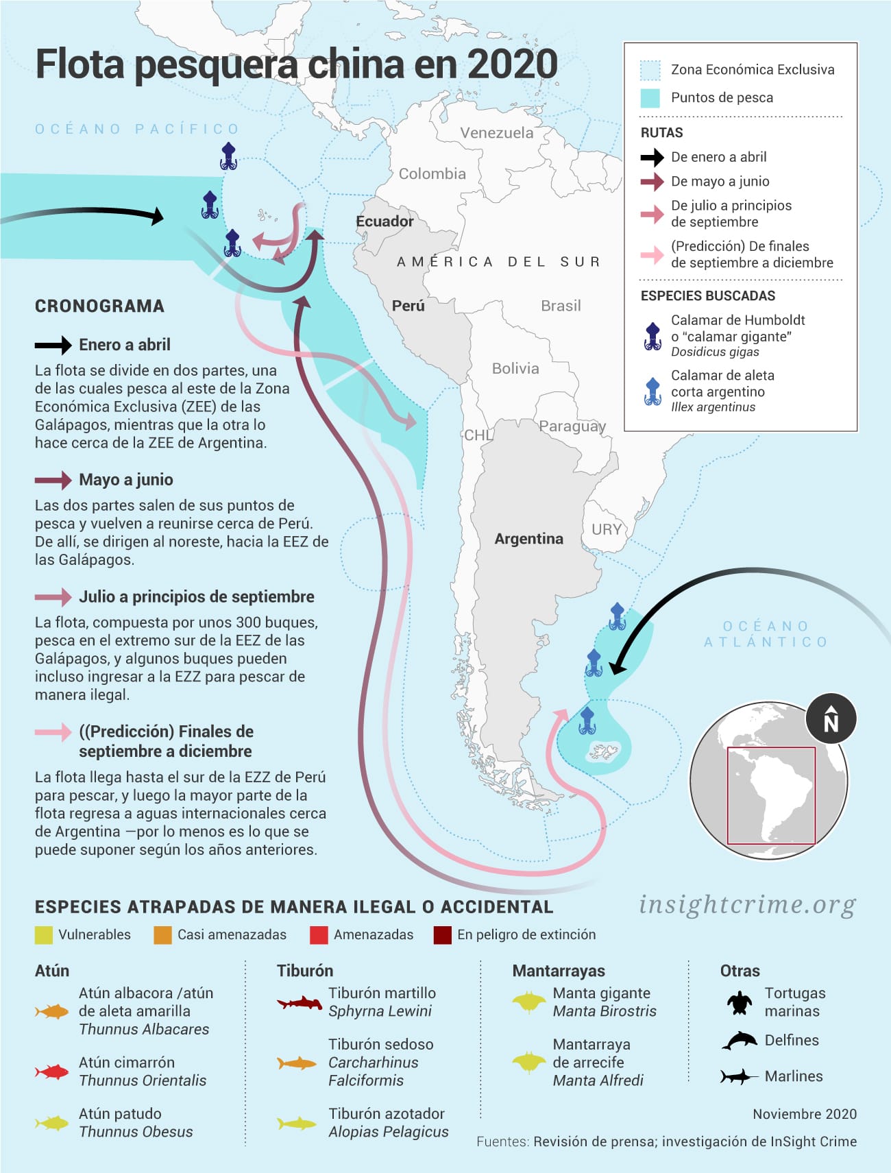 Este año, según ambos informes y un mapa de dominio público, elaborado por Global Fishing Watch, parte de la flota china permaneció al este de las Galápagos entre enero y abril, mientras que la otra parte se trasladó hacia aguas argentinas. Para el mes de mayo, las dos partes se habían reunido frente al sur de Perú, para luego trasladarse entre la ZEE de Galápagos y las aguas de la ZEE de Ecuador continental de mayo a septiembre, lo que provocó las protestas internacionales mencionadas. Desde entonces, la flota se ha desplazado hacia el sur, y la mayor parte se encuentra estacionada actualmente en aguas al sur de Perú, donde sus barcos continúan pescando.