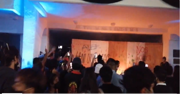 Los huracanes Delta y Zeta acaban de pasar por el Estado de Quintana Roo, dando más conmoción a la protesta del 9 de noviembre. “Déjalo quemar. ¡Que todo queme!” fue el lamento de su madre angustiada cuando las planchas de contrachapado que se pusieron para proteger las ventanas del ayuntamiento de Cancún toman fuego mientras unxs manifestantes pintan “Ni una menos. Ni una más. Alexis, Fátima” (Fátima era una niña de 7 años que fue secuestrada, violada y matada en la Ciudad de México en febrero). En este momento la policía comienza a golpear a reporteros, agarrar teléfonos celulares y disparar balas reales al aire encima de la multitud. A una reportera de la emisora local le golpearon con un batón y un fotógrafo resultó lesionado en la cabeza por una bala.
