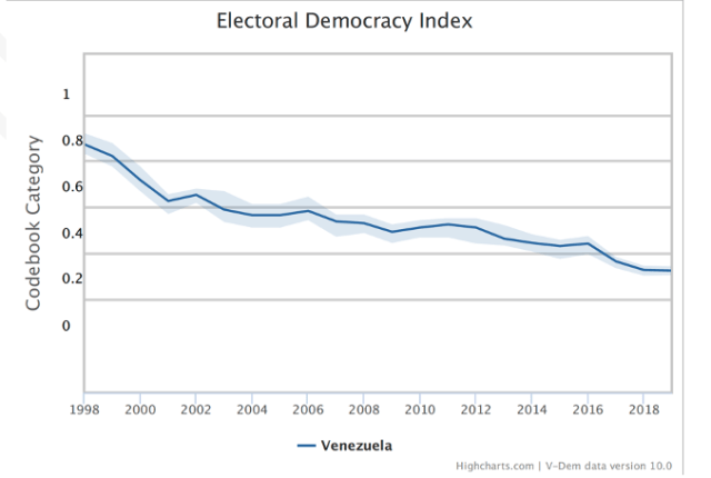 La evolución del índice de democracia electoral -que mide la competencia electoral por la aprobación del electorado- resumió el colapso de las condiciones de integridad electoral en Venezuela desde la elección de Chávez en 1998: