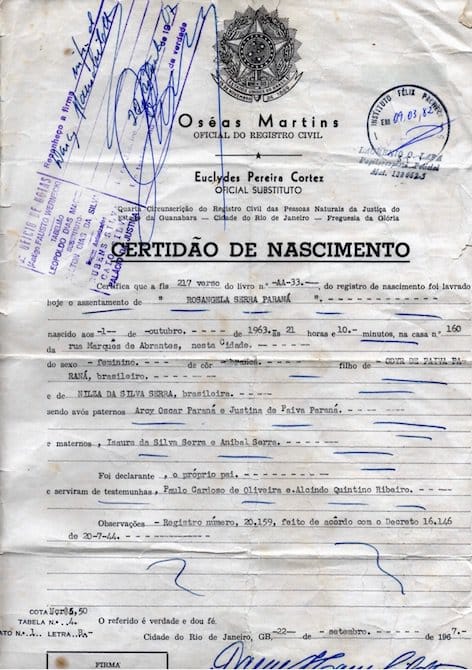 "Perto do dia primeiro de outubro de 2013, uma ‘prima’, pessoa que nunca conheci pessoalmente, revelou no meu Facebook que eu tinha que ser grata a família Paraná que me ‘pegou’ da minha mãe... Liguei para uma segunda ‘tia’ e essa de forma agressiva disparou a verdade. Disse que eu não era realmente filha de seu irmão, que o pai forjou a minha certidão e que primeiro de outubro não era a data do meu aniversário e sim o dela e que todos os dados tinham sido forjados”. Esta informação foi logo confirmada por Eduardo Reina, quem conseguiu localizar a certidão de nascimento original que declarava que Rosângela era a "filha ilegítima" dos Paraná.