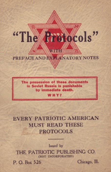É sabido, desde 1921, que Os Protocolos dos Sábios de Sião são uma fraude grotesca de “Diálogo no Inferno entre Maquiavel e Montesquieu”, escrito por Maurice Joly, como demonstrado numa série de artigos do The New York Times. O escrito original não trata sobre raça ou religião, bem como não menciona a questão judaica. A fraude é tão explícita que Os Protocolos copiam 80% da mesma estrutura e sequência de conteúdos dos Diálogos.