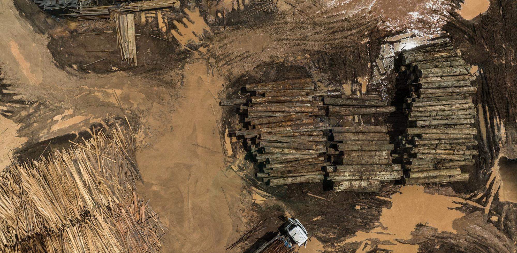 O alto valor de algumas madeiras tropicais é uma ameaça constante à floresta. Em uma rodovia a oeste de Açaizal, um trabalhador de uma madeireira passa um tronco enorme por uma serra industrial, que corta uma tábua da espessura de uma enciclopédia. Outros trabalhadores moldam a tábua bruta em dimensões padrão.