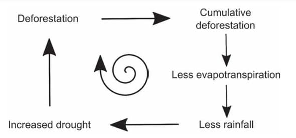 Para Bolsonaro, é simplesmente uma questão de falta de sorte. "Não chove, né? É a maior crise que se tem notícia. Demos mais um azar aí", disse em julho do ano passado. Os cientistas dizem o contrário: o desmatamento contínuo e o aquecimento global atuam juntos em um ciclo mortal (ilustrado no diagrama abaixo), tornando a floresta tropical mais inflamável do que nunca. E sem os rios voadores — formados pelas 20 bilhões de toneladas de vapor de água exaladas pelas árvores da Amazônia —, o centro e o sul do Brasil, incluindo cidades como São Paulo, Rio de Janeiro e Belo Horizonte, podem se tornar um deserto.