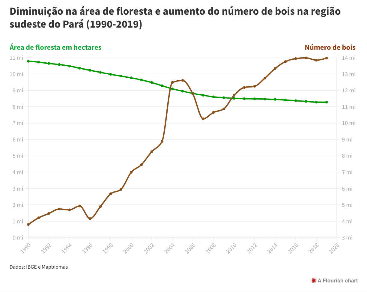 De acordo com os dados da Pesquisa da Pecuária Municipal, do IBGE, em 1990 (primeiro ano de dados disponível da região) existiam 3,8 milhões de cabeças de gado no Sudeste do Pará. Em 2019, este número passou para 13,9 milhões.