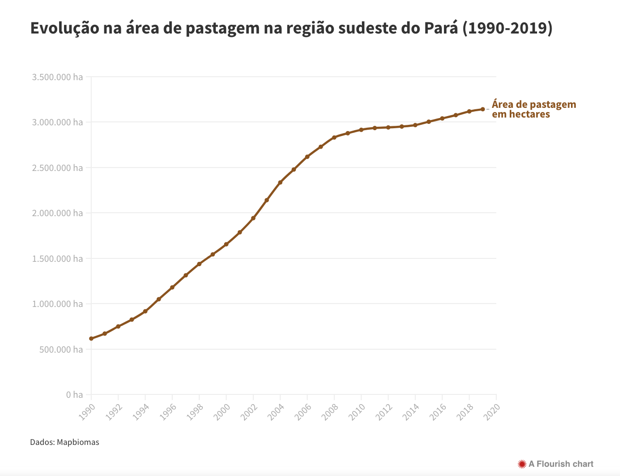 Enquanto isso, a área de floresta nestes seis municípios, de acordo com dados obtidos no MapBiomas, caiu de um total de cerca de 10,7 milhões de hectares em 1990 para cerca de 8,2 milhões de hectares em 2019. E a área de pastagem passou de 617 mil hectares em 1990, para 3,1 milhões em 2019. É, literalmente, o gado comendo a floresta. Ou melhor, o gado comendo o capim que cresce sobre as ruínas das florestas que os fazendeiros desmataram.