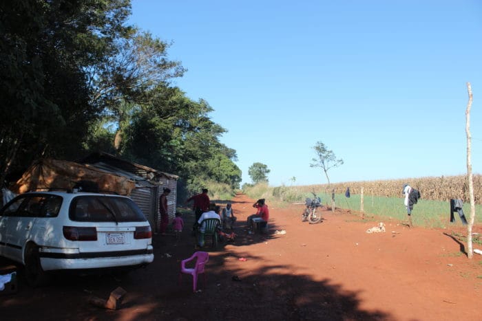 Carmen está sentada em uma cadeira de plástico ao lado de um caminho de terra. De um lado dessa estrada estreita, há um campo aparentemente interminável usado para a agricultura comercial em larga escala. Do outro lado está a reserva natural de Limoy – uma área de 13,3 km2 de floresta densa administrada pela Itaipu Binacional, uma instituição que pertence e é administrada conjuntamente pelos estados paraguaios e brasileiros que também é responsável pela barragem de Itaipu. Esta fina faixa de terra entre as duas paisagens contrastantes é, atualmente, o lar temporário das 43 famílias que compõem Tekoha Sauce.