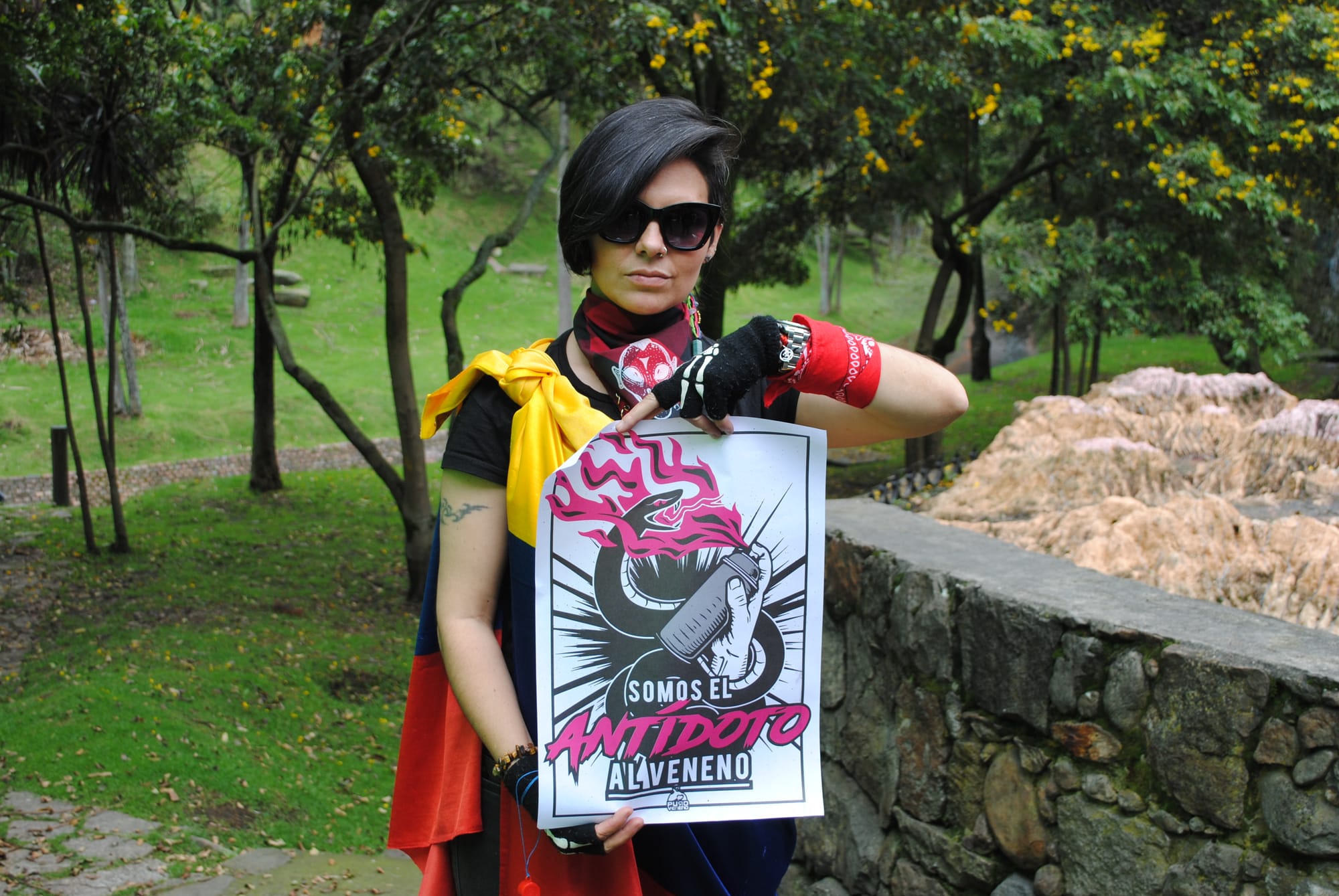 Temos que resistir em todos os aspectos de nossas vidas, desde as compras que fazemos para a casa até sair a protestar, porque esses atos cotidianos são atos políticos. Acho que todos temos que levantar e mostrar nossa inconformidade com o governo de alguma forma. Estou aqui protestando porque toda vez que o governo aprova outra reforma do sistema tributário, como músico, eu fico mais pobre, e os que estão no topo ficam mais ricos. Também manifesto pelo respeito à vida humana, pelos assassinatos de líderes sociais, pelo respeito às nossas comunidades indígenas, nossos ancestrais, nossos camponeses que sofrem com todos os produtos que estamos trazendo de fora. Neste governo estão todos os corruptos da história do país. É como se eles tivessem reunido todos os vilões do filme do Super-Homem e os colocado na mesma sala.