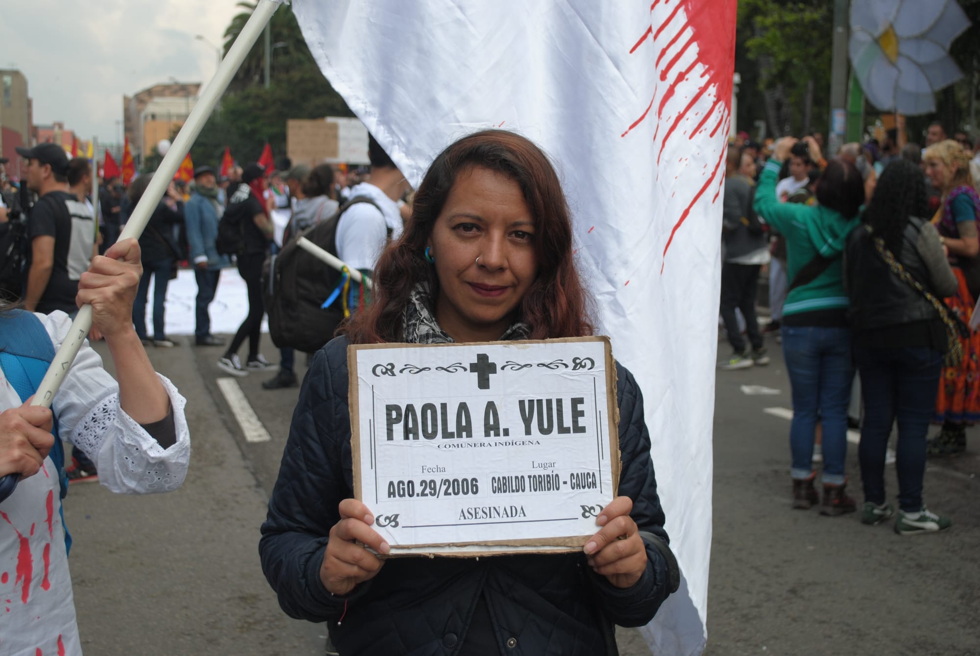 Hoje eu estou com a Guarda Indígena da Colômbia marchando pelos assassinatos de líderes sociais. Também marchamos por respeito à educação e à saúde, contra as reformas que o Estado está impondo e, acima de tudo, para exigir uma qualidade de vida para nós e nossos filhos. A greve nacional é um movimento que se opõe às políticas do governo para baixar os salários dos mais jovens e reduzir as aposentadorias, mas também estamos cansados de um Estado que esconde informações, como foi o caso do atentado. Como membro de um grupo de teatro da comunidade, tenho a obrigação de estar aqui e defender os direitos da minha comunidade.