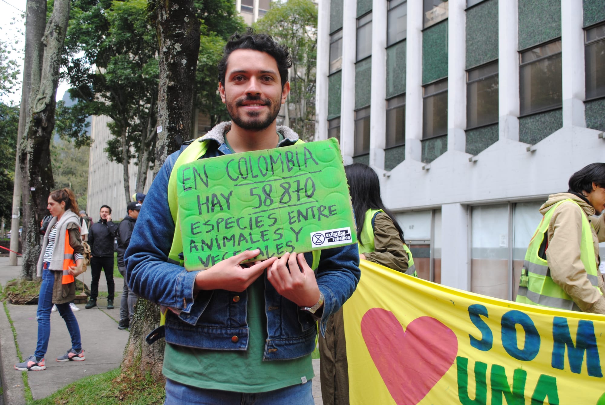Muitas coisas estão erradas neste governo. Por exemplo, não fazem o suficiente para combater a mudança climática, que também está ligada a muitas causas sociais. Estamos aqui com a Extinction Rebellion protestando contra as ações do governo das quais discordamos, mas também protestamos contra a falta de ação na emergência climática. Esse governo quer voltar à erradicação de cultivos com glifosato, produto químico cancerígeno, também apoia o fracking, uma prática muito prejudicial ao meio ambiente, e quer fazer mineração em Páramos, onde existem ecossistemas únicos necessários para nossa sobrevivência. Fora multinacionais na América Latina!
