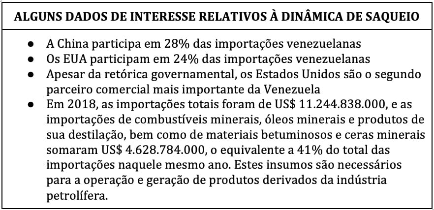 São consumos baseados em remessas, extrativismo de mineração (ouro, diamantes) [ii], importação de alimentos [ii], entre outros; bem como a nova economia de bodegas (estabelecimentos comerciais de produtos importados inacessíveis à maior parte da população) que surgiram no segundo semestre de 2019, juntamente com a liberalização/dolarização de facto da economia. Agora, com a crise final da empresa estatal Petróleos da Venezuela (PDVSA), são abertos mecanismos legais para maior privatização da empresa, bem como para a reestruturação do sistema de distribuição de combustível.