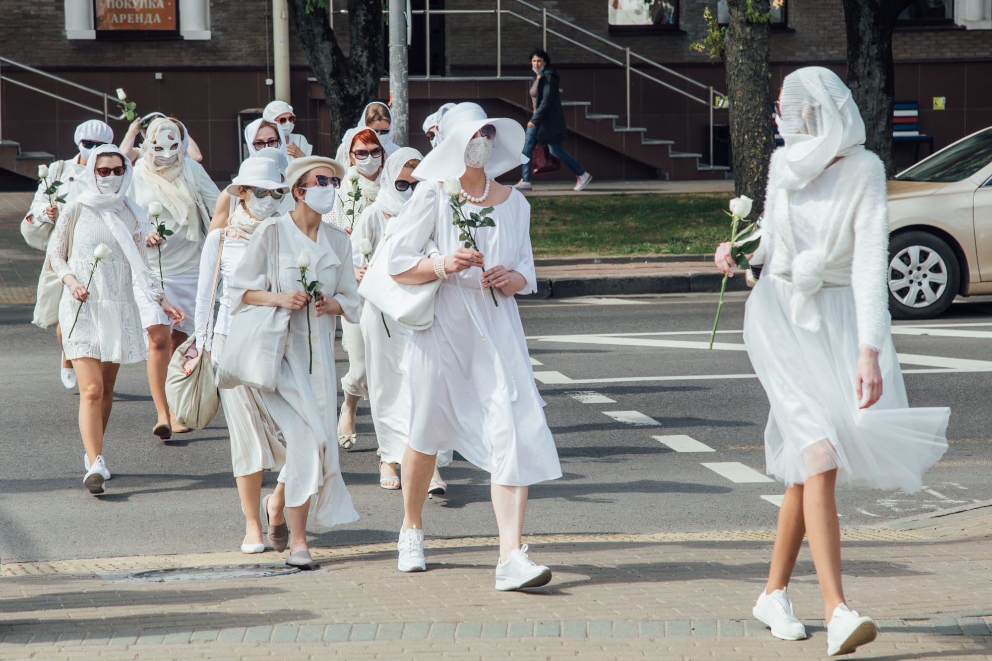 Я бы выделила два основных вида уличных протестов, которые остались к маю 2021: редкие дворовые марши и акции "девушек в белом". Загадочные девушки выходили на улицы Минска примерно раз в две недели, чаще всего надевали светлую одежду, маскировали лица, иногда брали с собой бело-красно-белые зонтики. Они ничего не выкрикивали, не блокировали дороги – не делали ничего из того, за что сейчас судьи дают тюремные сроки.