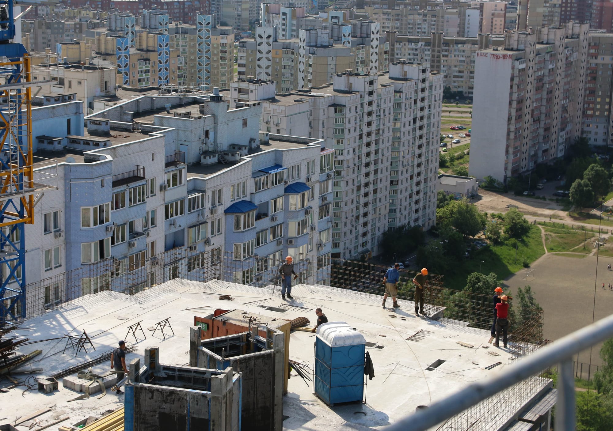 Строительство комплекса, унесшее жизни двух рабочих, ведется посреди жилого массива Осокорки на левом берегу Киева. Два 24-этажных дома уже готовы, остальные четыре – в процессе. Будущий жилой комплекс окружают широкие шумные дороги и лес из высоток. Ручейком к проходной стягиваются строители со сменной одеждой в рюкзаках и дорожных сумках.