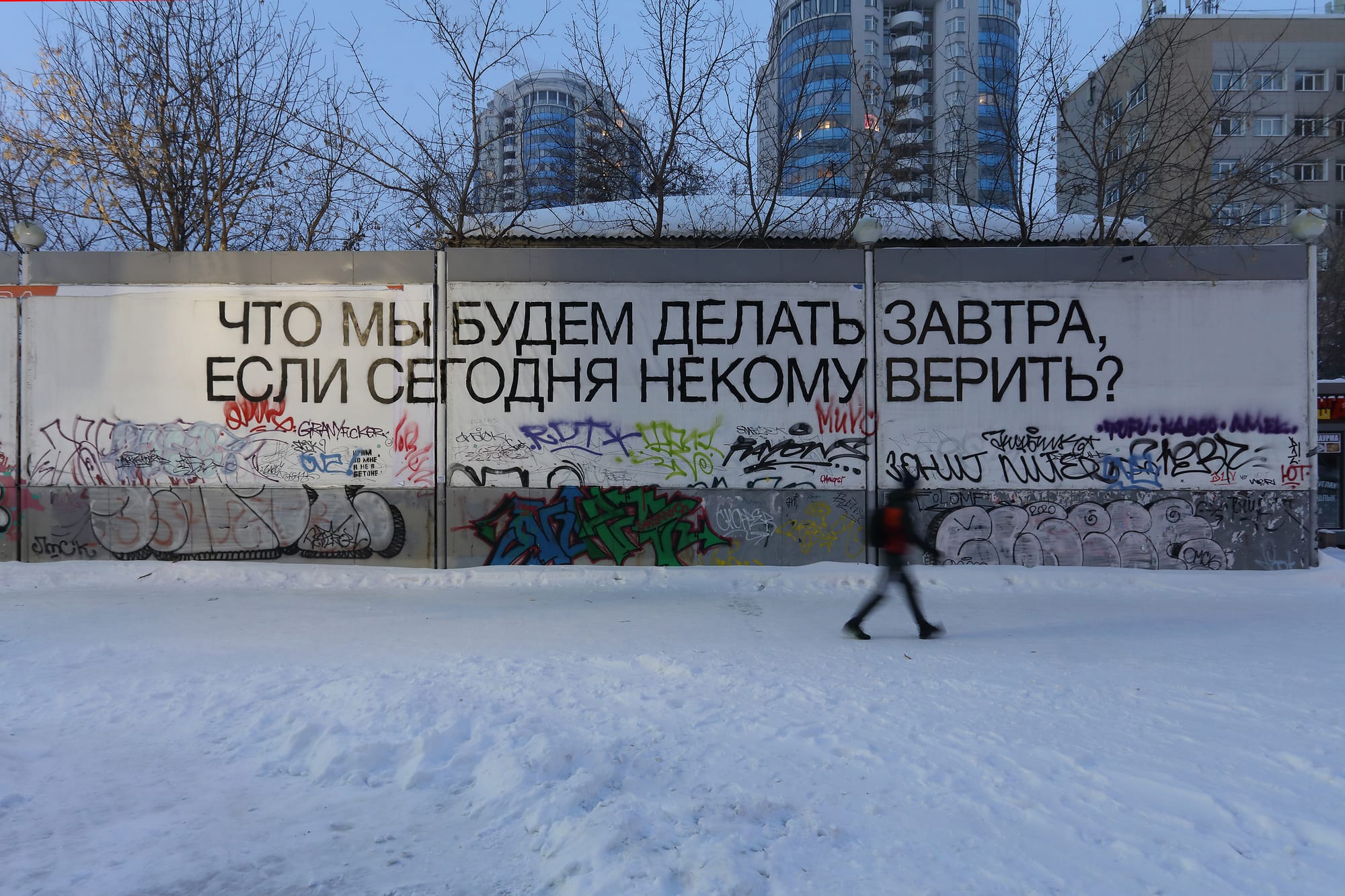 Например, взять зиму 2021 года в Екатеринбурге. Атмосфера напряженная: на следующий день собирается большой митинг. Я думаю, что бы сделать подходящее. Смотрю в заметки и тексты, вижу фразу из песни группы I.F.K. (Insect Flyin Killa — музыкальная группа из России), которая у меня лет пятнадцать лежит: "Что мы будем делать завтра, если сегодня некому верить?".
