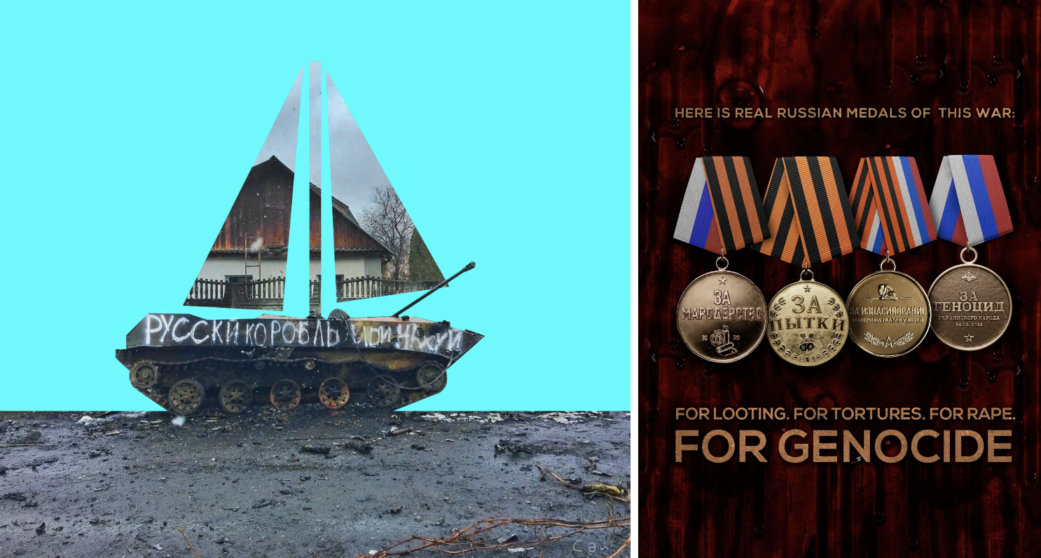 Художник Алексей Сай создает плакаты на военные темы. Активисты используют их на демонстрациях в поддержку Украины во всем мире. “Вчера сделал несколько вариантов плакатов по мотивам высказываний Пескова (пресс-секретаря президента РФ – прим. ред.). У посольства России в Лондоне собираются установить один из них”, – говорит Сай. Художник выложил работы в открытый доступ, чтобы любой желающий мог воспользоваться ими.