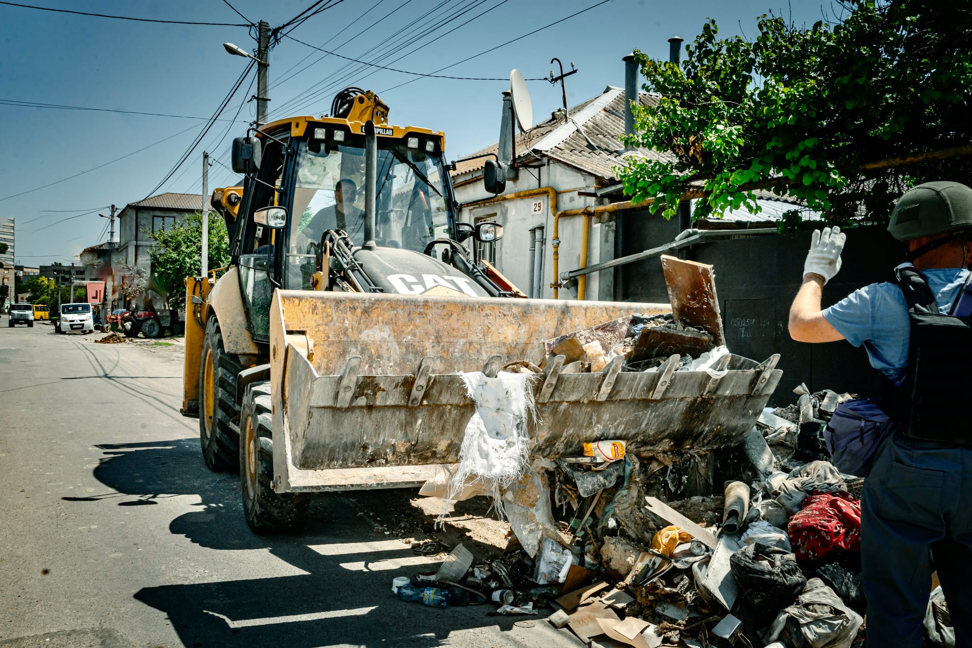 Прохладным апрельским утром тишину малолюдной улицы в старом центре Херсона нарушает грохот опрокинутого с тротуара тысячелитрового контейнера с мусором. Двое в бронежилетах невозмутимо выгребают содержимое прямо на проезжую часть и берутся за следующий. Зловонная куча растет перед крыльцом штаб-квартиры благотворительного фонда "Город силы". Дима, один из координаторов местных волонтеров, выходит на крыльцо с кофе и тут же пресекает мою попытку возмутиться происходящим: "Не парься, это коммунальщики".