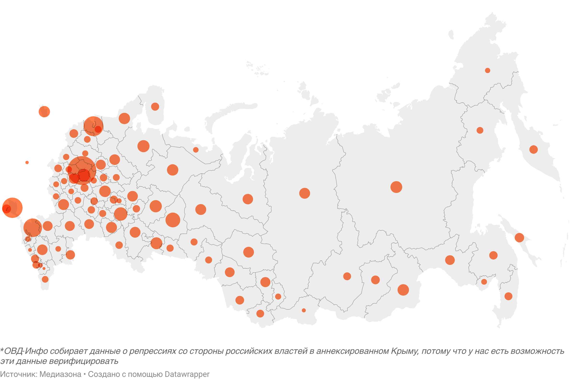 Распределение уголовных дел по антивоенным делам по регионам России. Источник: ОВД-Инфо. Публикуется с разрешения
